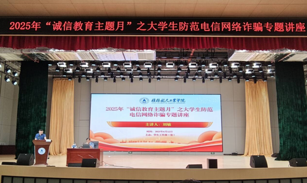为筑牢青春防线,共筑诚信校园,6月12日,2025年“诚信教育主题月”之大学生防范电信网络诈骗专题讲座在问天楼报告厅举办。讲座由学工处、保卫处组织开展,邀请桂林市公安局七星区反诈中心主任刘敏入校授课,吸引了700多名师生到场学习。