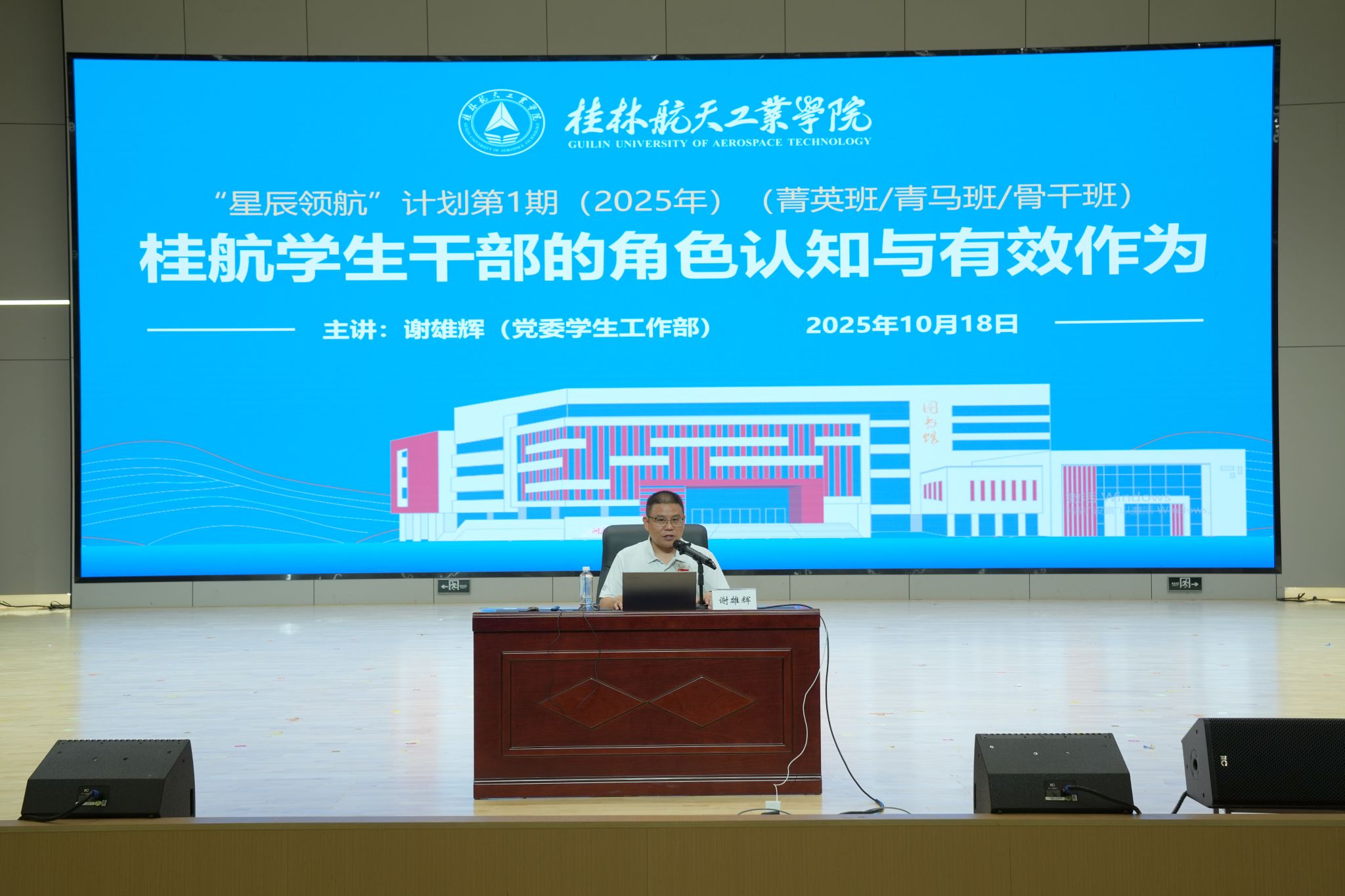 10月18日上午10:00,学校“星辰领航”学生骨干素质能力提升计划首期培训班第一讲在图书馆报告厅举行。学校党委学生工作部部长谢雄辉同志以“桂航学生干部的角色认知与有效作为”为题,为“星辰领航”计划菁英班、青马班、骨干班600余名学员进行首场培训。