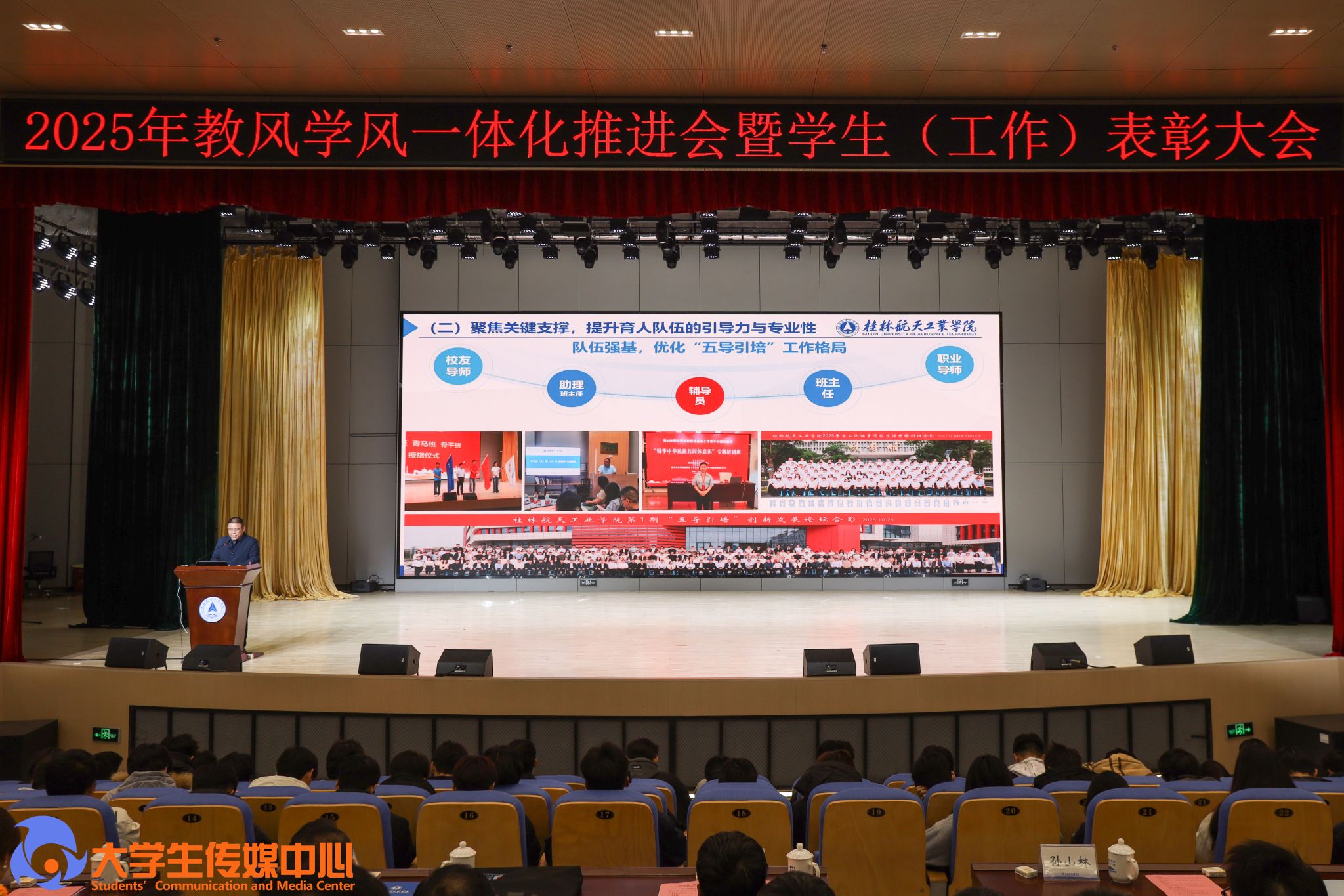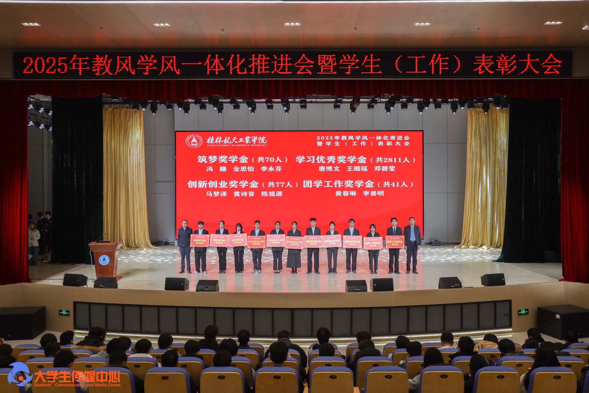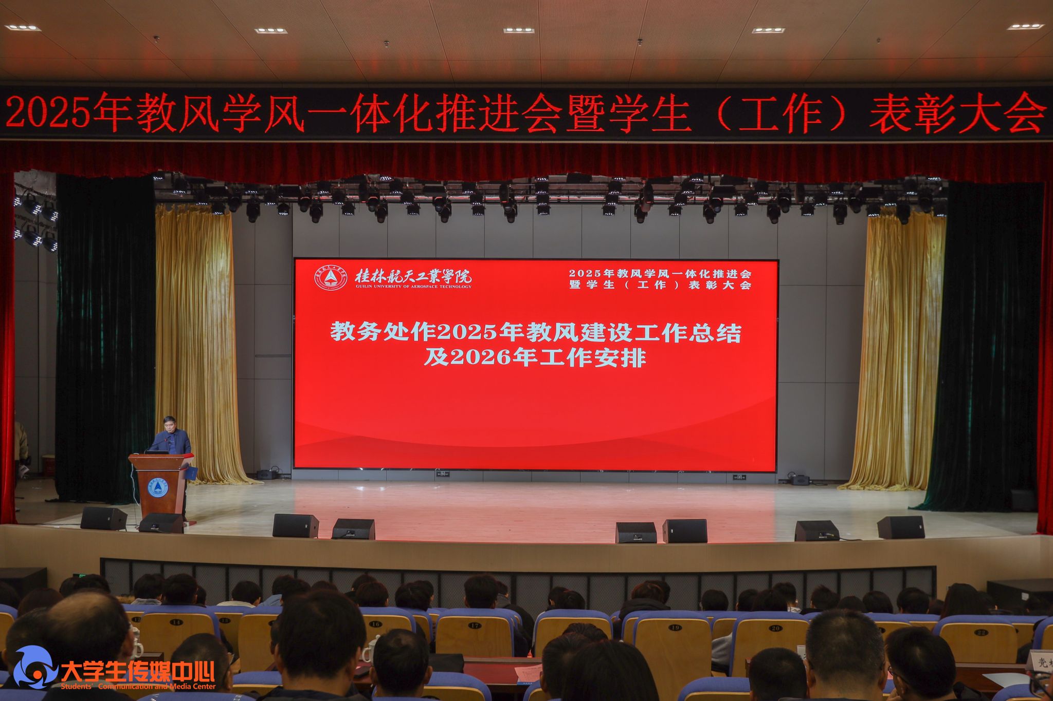 2025年12月23日下午,学校在问天楼图书馆报告厅举行“星辰耀桂航·领航启新章”2025年教风学风一体化推进会暨学生(工作)表彰大会。学校党委书记韩峻峰,党委副书记、校长吴尽昭,党委副书记孙山林出席大会。桂林爱尔眼科医院党支部书记段绪艳、学校党校办、组织部、宣传部、学工部(处)、教务处、校团委等职能部门负责人,各学院党政负责人、专业负责人、教研室主任、辅导员、班主任及获奖学生、在校学生代表共同参加了会议。