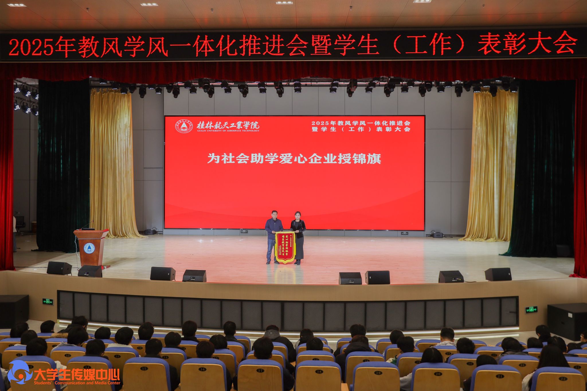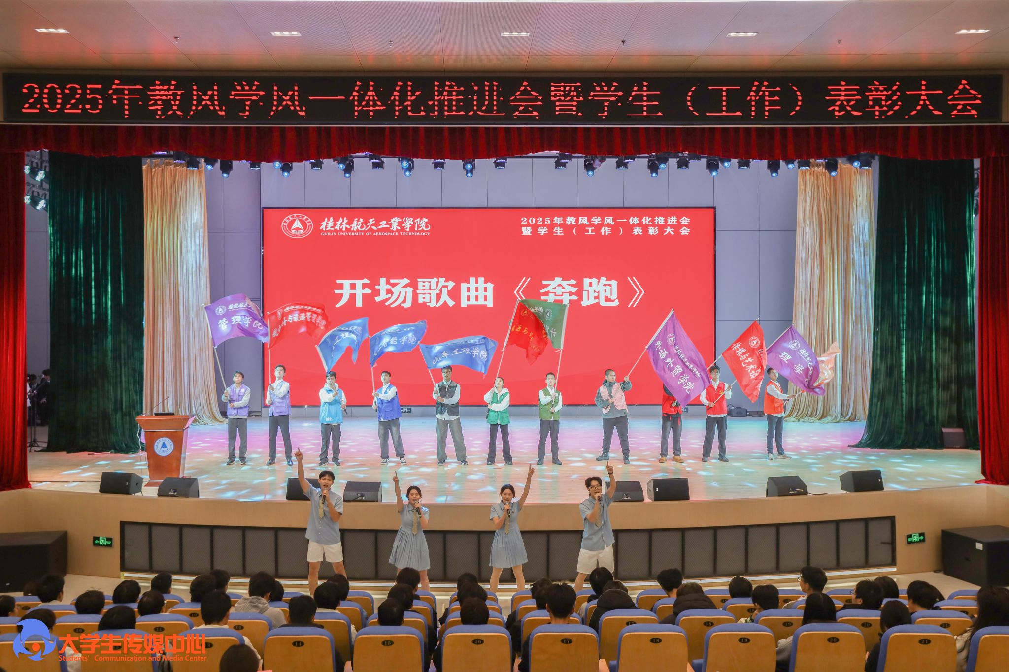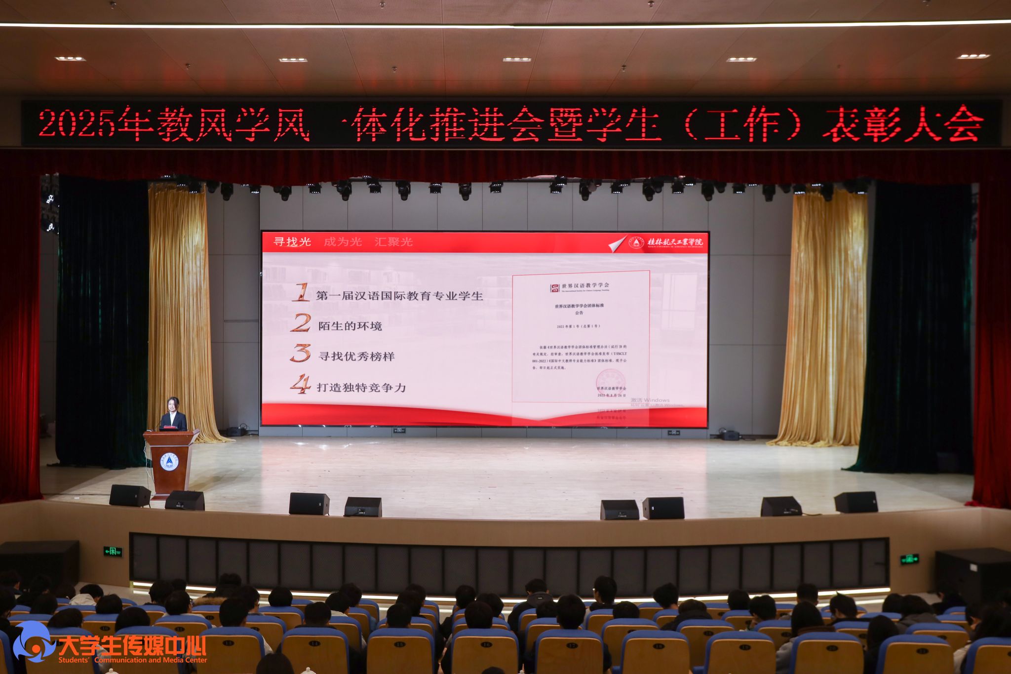 2025年12月23日下午,学校在问天楼图书馆报告厅举行“星辰耀桂航·领航启新章”2025年教风学风一体化推进会暨学生(工作)表彰大会。学校党委书记韩峻峰,党委副书记、校长吴尽昭,党委副书记孙山林出席大会。桂林爱尔眼科医院党支部书记段绪艳、学校党校办、组织部、宣传部、学工部(处)、教务处、校团委等职能部门负责人,各学院党政负责人、专业负责人、教研室主任、辅导员、班主任及获奖学生、在校学生代表共同参加了会议。