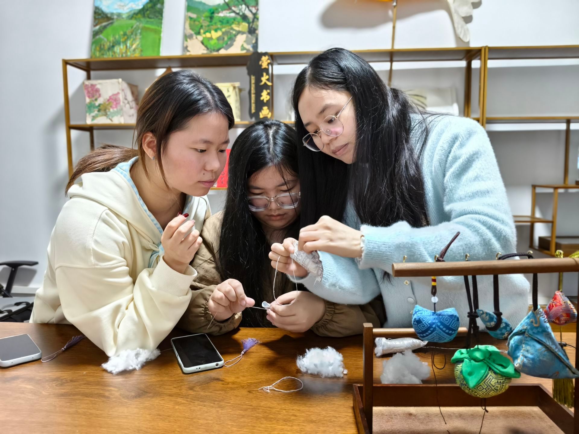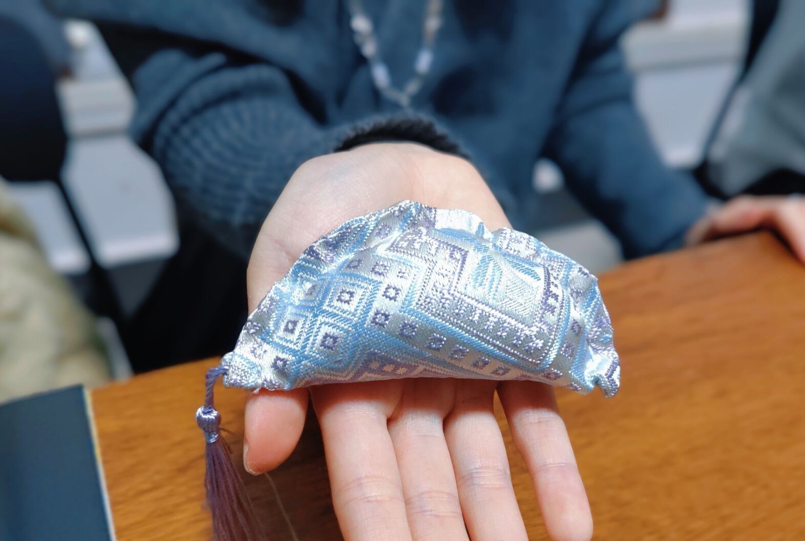 活动中,主讲老师介绍了中国四大名锦之一壮锦的历史与工艺,并结合冬至这一节气,讲述了各地不同的民俗传统,帮助同学们进一步理解壮锦的文化内涵。实践环节中,同学们将壮锦技艺融入手工制作中,亲手缝制出一枚枚独具特色的“壮锦饺子”,在动手协作中体验传统文化之美。现场气氛温馨活跃,洋溢着浓厚的节日氛围。