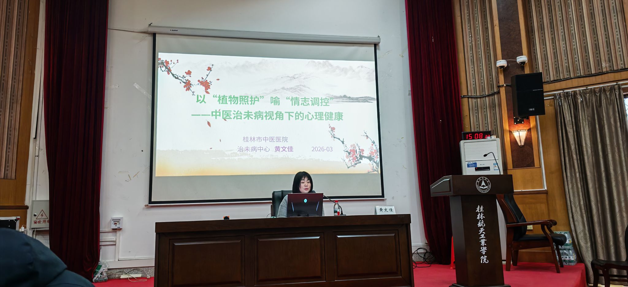 讲座中,桂林市中医院专家先以《大学生身心健康现状及中医认识与治疗》为题,结合当代大学生常见的亚健康状态、作息紊乱、情绪波动等问题,从中医整体观念出发,深入浅出地阐述了阴阳平衡、脏腑调和与身心健康的密切关系。大学生在学业与生活压力下,更应注重顺应自然规律,通过合理饮食、规律作息、适度运动等方式维护身体根基,防病于未然。随后《以“植物照护”喻“情志调控”——中医治未病视角下的心理健康》的新颖视角,以植物生长所需的阳光、水分、土壤为喻,生动诠释了情绪管理、心理调适在维护心理健康中的重要作用。从中医“七情内伤”理论切入,详细讲解了情志失调对脏腑功能的影响,并分享了以“疏、导、养”为核心的情志调节方法,引导学生在面对压力时学会自我觉察、主动疏导、涵养心性,实现“未病先防、既病防变、瘥后防复”的健康目标。